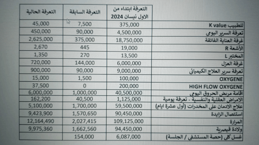 وفي ما يلي تجدون جدولاً بالتعرفة الصحية الجديدة: