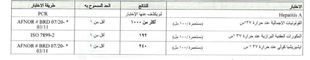 – إيشيريشيا كولي: ٢٤٠ مستعمرة لكل ١٠٠ مل (النتيجة يجب أن تكون أقل من ١).