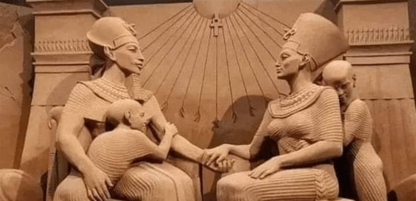 تداول رواد مواقع التواصل الاجتماعي صورة ادّعى ناشروها أنّها لمنحوتة صنعها المصريّون القدماء تمثّل "حبّ الملك إخناتون لزوجته نفرتيتي".