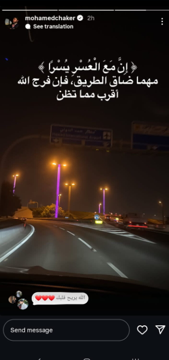 وكتب شاكر عبر خاصية الستوري:” إن مع العسر يسر.. مهما ضاق الطريق، فإن فرج الله أقرب مما تظن".