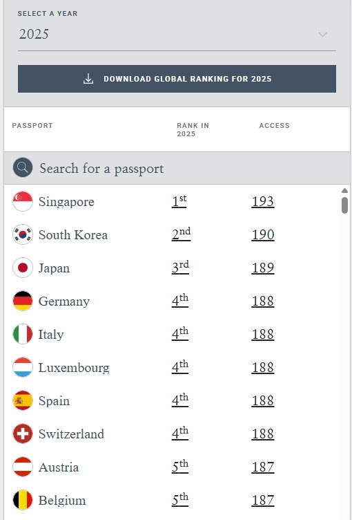 في المقابل، احتلت سنغافورة المركز الأول عالمياً بإمكانية دخول 193 وجهة، تلتها كوريا الجنوبية بـ190 وجهة، ثم اليابان بـ189 وجهة. وضمّت المراتب العليا أيضاً دولاً أوروبية مثل ألمانيا، إيطاليا، لوكسمبورغ، وإسبانيا مع 188 وجهة، بينما جاءت المملكة المتحدة والإمارات العربية المتحدة في المركز الثامن مع 184 وجهة، وكندا في المركز التاسع مع 183 وجهة.