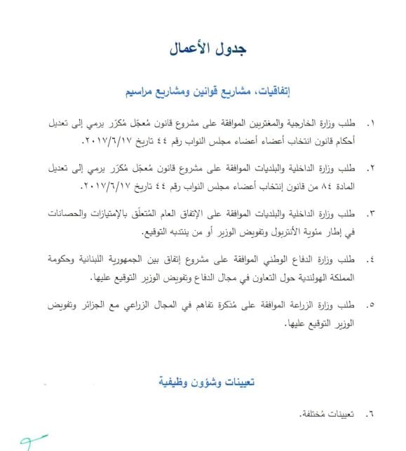 وبحسب الدعوة الرسمية الموقّعة من الأمين العام لمجلس الوزراء القاضي محمود مكية، والمتضمّنة جدول الأعمال الكامل، فإنّ أبرز البنود المدرجة يتعلقان بطلبين من وزارتَي الخارجية والداخلية لتعديل قانون الانتخاب رقم 44/2017، في خطوة تُعدّ إشارة واضحة إلى نية الحكومة إعادة تحريك الملف الانتخابي بعد فترة طويلة من الجمود والتقاعس.