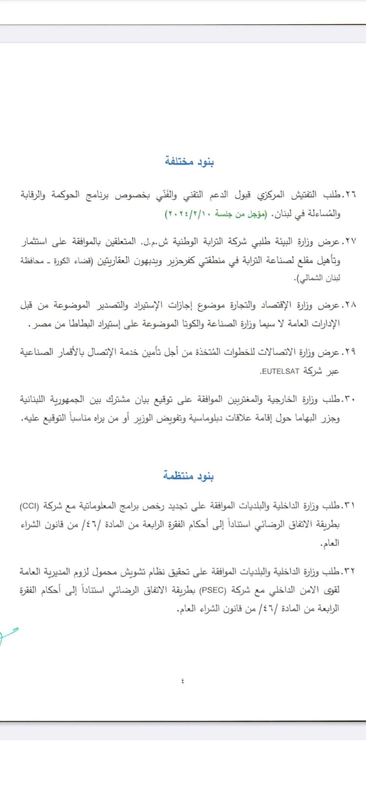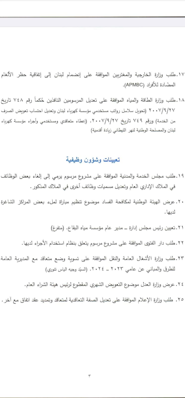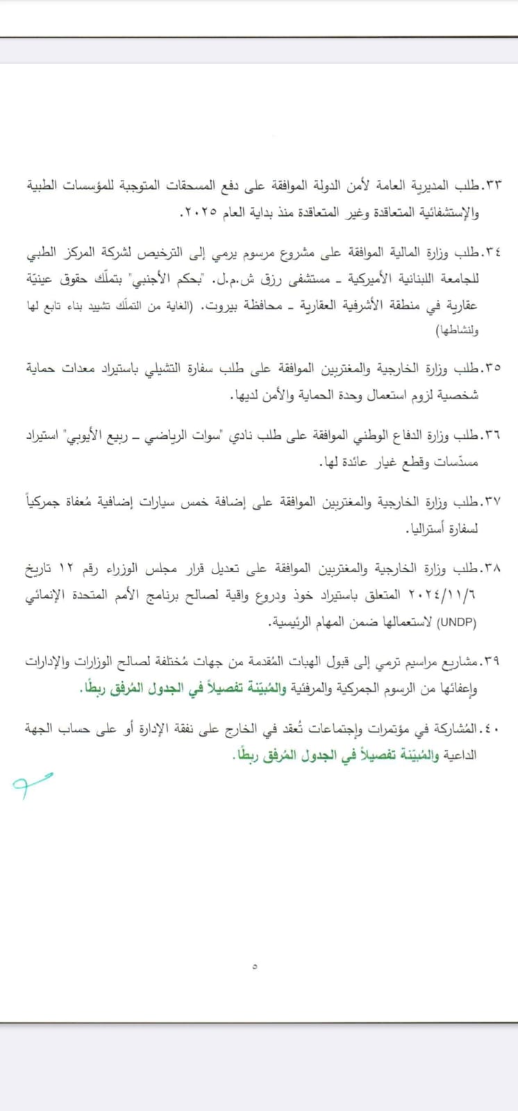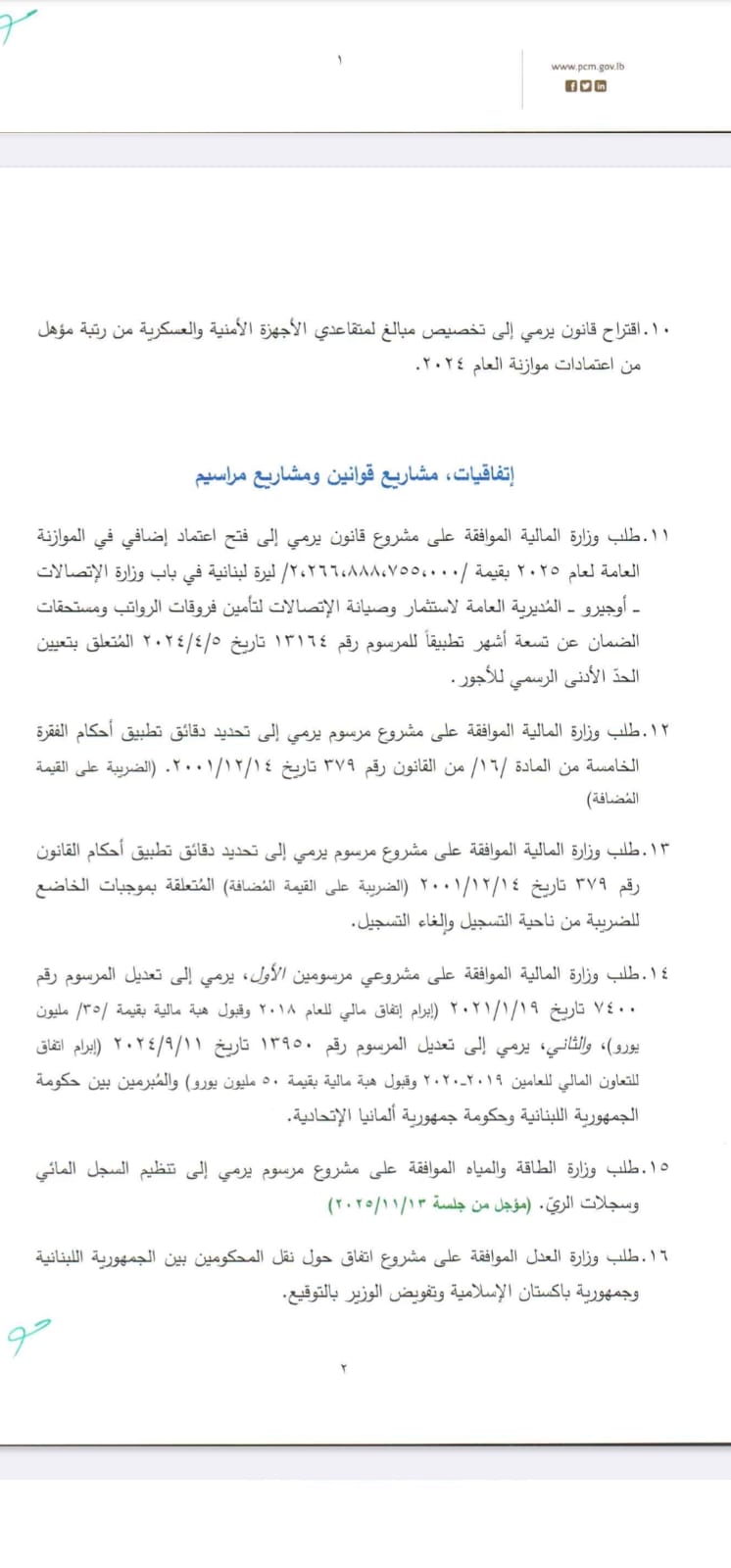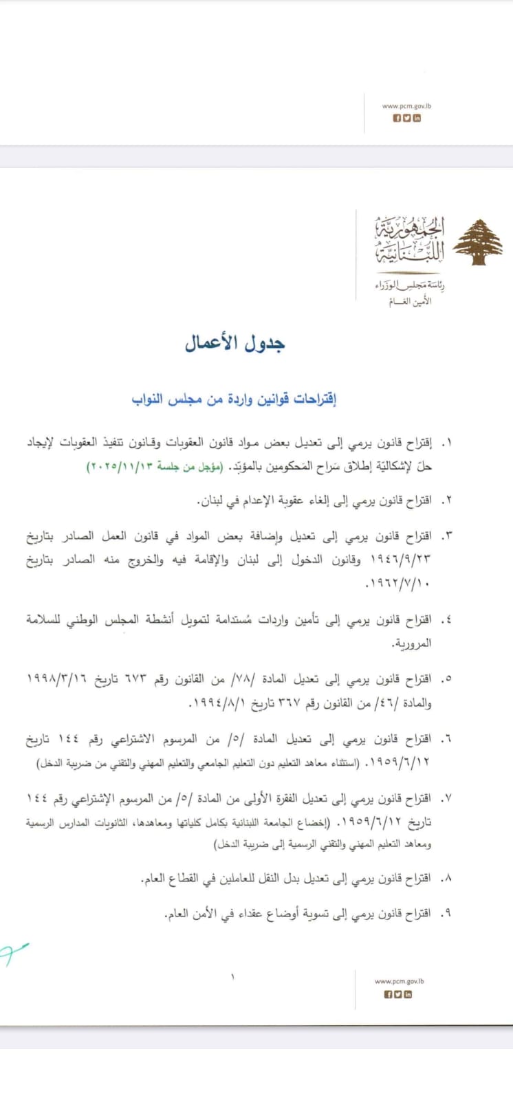 يعقد مجلس الوزراء جلسة عند الساعة الثالثة من بعد ظهر يوم الخميس 20-11-2025، في القصر الجمهوريّ، لبحث المواضيع المبيّنة في جدول الأعمال أدناه