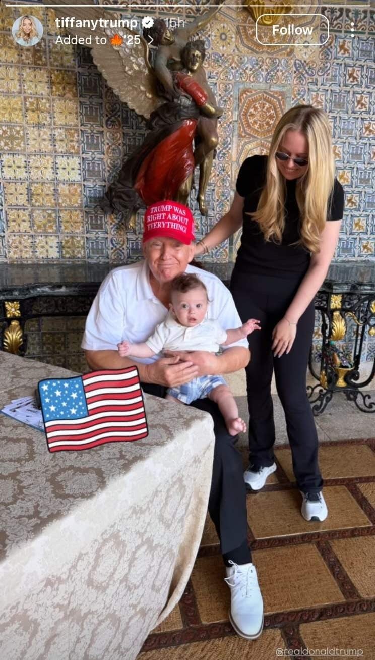 نشرت تيفاني، ابنة الرئيس الأميركي دونالد ترامب، صورًا عبر خاصية "ستوري" على حسابها في "إنستغرام"، ظهر فيها ترامب وهو يحمل حفيده ألكسندر. وعلّقت تيفاني على الصور بالقول: "الجدّ وألكسندر، العمل بجهد".
