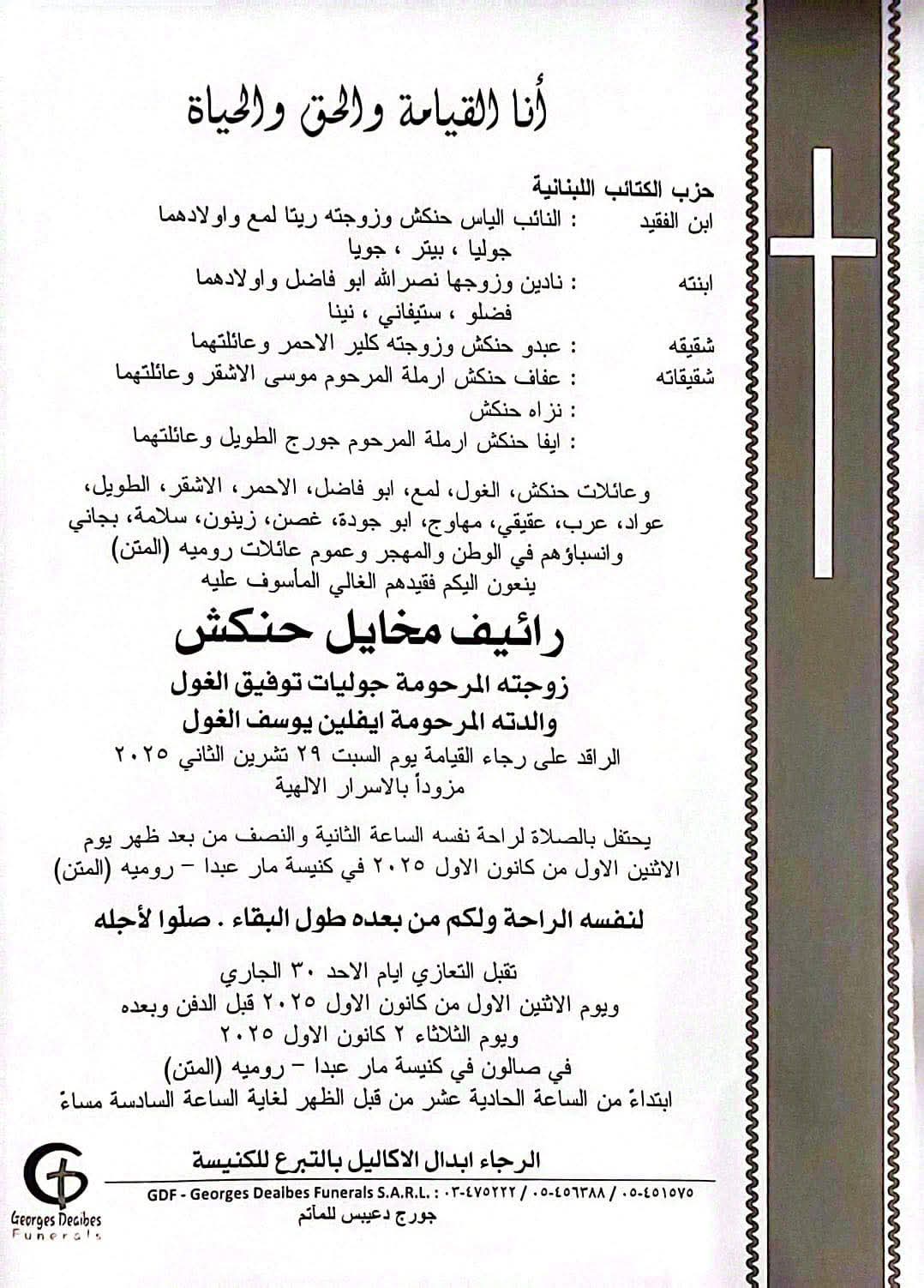 تقبل التعازي أيام الأحد 30 الجاري، ويوم الاثنين الأول من كانون الأول 2025 قبل الدفن وبعده ويوم الثلاثاء 2 كانون الأول 2025 في صالون كنيسة مار عبدا - روميه (المتن) ابتداءً من الساعة الحادية عشرة من قبل الظهر وحتى الساعة السادسة مساءً.