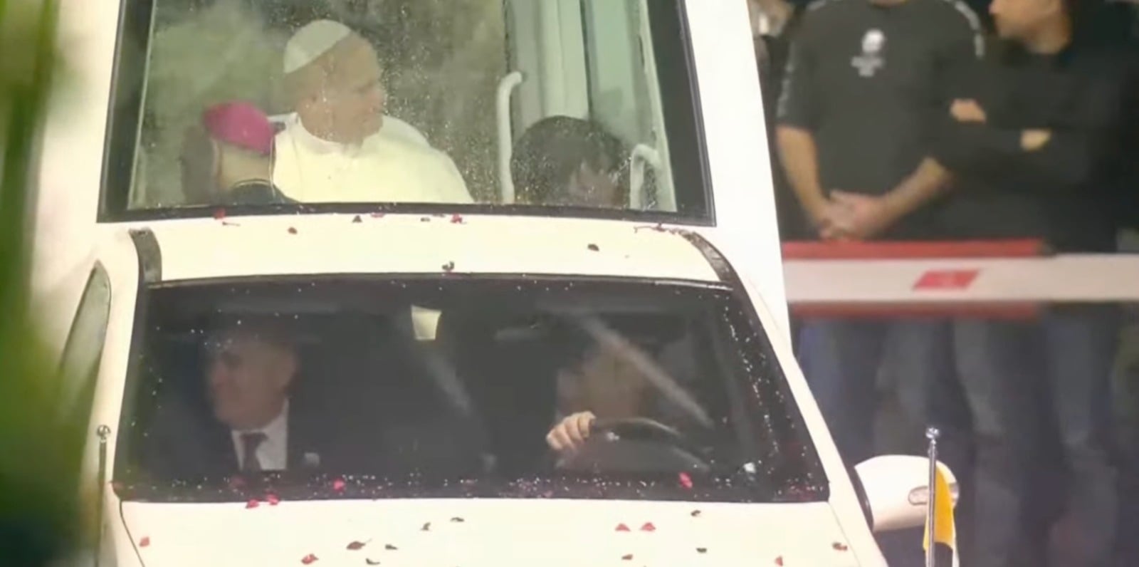 وتوقفت سيارة البابا، بعد ذلك، أمام نافورة القصر لمشاهدة عرض مصوّر خُصّص للمناسبة، حيث بدا عليه الفرح.