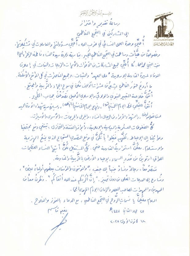 حيّا الأمين العام لحزب الله الشيخ نعيم قاسم وحدة العمل النسائي في حزب الله، مثنيًا على دور مسؤولتها والعاملات في مختلف تشكيلاتها، ولا سيّما اللواتي هيّأن وأسهمن في تنظيم التجمّع الفاطمي الكبير لمناسبة ولادة سيدة النساء فاطمة الزهراء (ع)، بنت النبي محمد (ص).