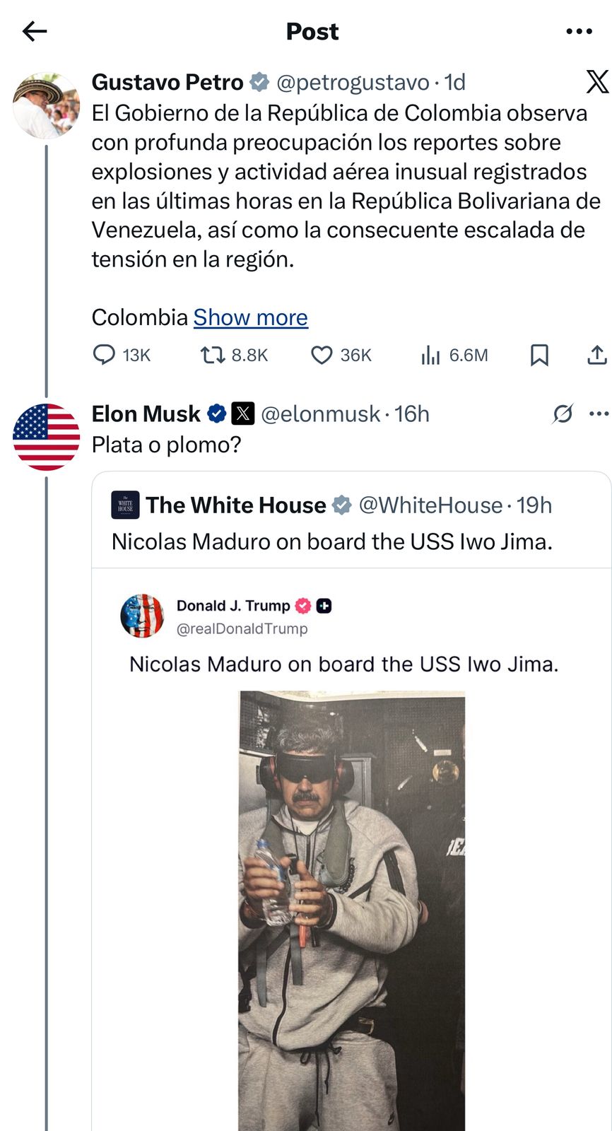 واستخدم ماسك في تعليقه عبارة "الفضة أو الرصاص"، وهي صيغة تحمل دلالات تهديد واضحة في السياق اللاتيني، وترتبط تاريخياً بثقافة الجريمة المنظمة في كولومبيا. وقد اشتهرت هذه العبارة عالمياً من خلال مسلسل "ناركوس"، حيث استُخدمت للتعبير عن خيارين قسريين: الرشوة أو القتل، ونُسبت إلى تاجر المخدرات الكولومبي بابلو إسكوبار في تهديده لعناصر الشرطة والمسؤولين.