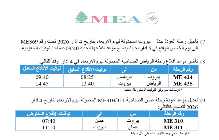 أعلنت شركة طيران الشرق الأوسط – الخطوط الجوية اللبنانية تعديل مواعيد رحلات بسبب إغلاق المجالات الجوية في معظم دول المنطقة نتيجة التطوّرات.