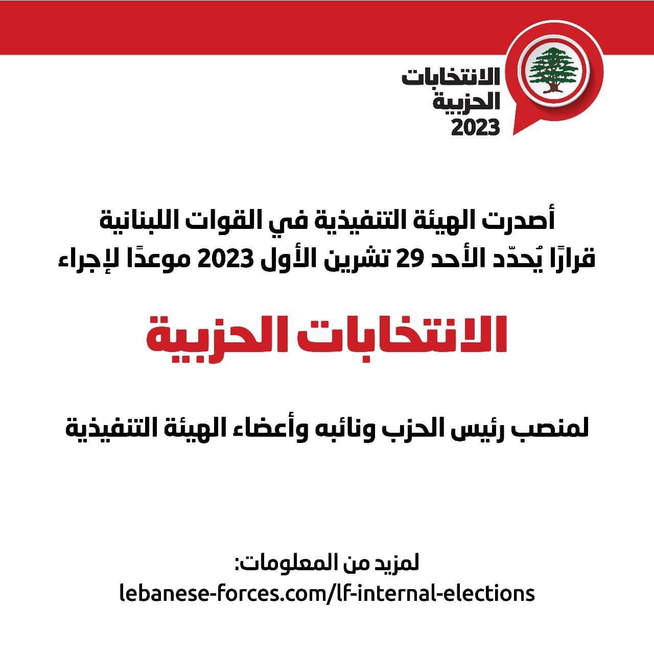 حددت الهيئة التنفيذية في حزب القوات اللبنانية، في بيان، “يوم الأحد 29 تشرين الأول 2023 موعدًا لإجراء الانتخابات الحزبية لمنصب رئيس الحزب ونائبه وأعضاء الهيئة التنفيذية”.
