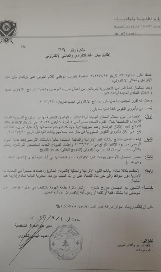 صدر عن المديرية العامة للأحوال الشخصية بيانًا أعلنت فيه تاريخ بدء العمل على برنامج بيان القيد الإفرادي والعائلي الالكتروني, حيث سيباشر العمل بهذا النموذج بتاريخ 11/9/2023