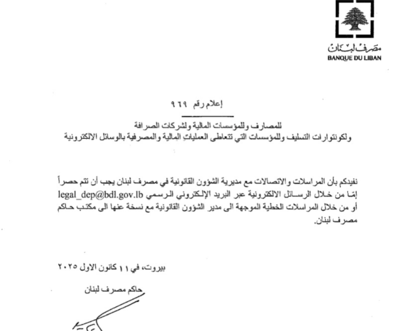 وجّه مصرف لبنان إعلاماً إلى المصارف والمؤسسات المالية وشركات الصرافة ولكونتوارات التسليف وللمؤسسات التي تتعاطى العمليات المالية والمصرفية بالوسائل الالكترونية.