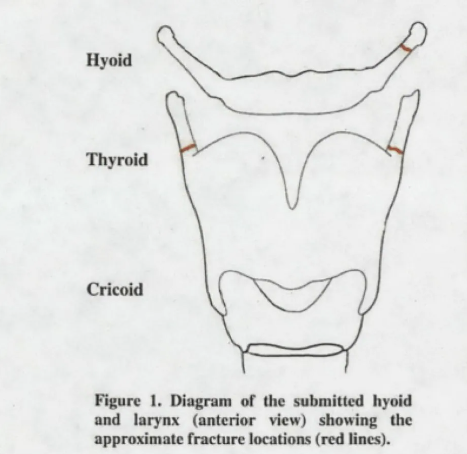 وقد خالفت سامبسون هذا الرأي، قائلة إن كسور العظم اللامي والغضاريف تُرى في كل من حالات الانتحار والقتل العمد.